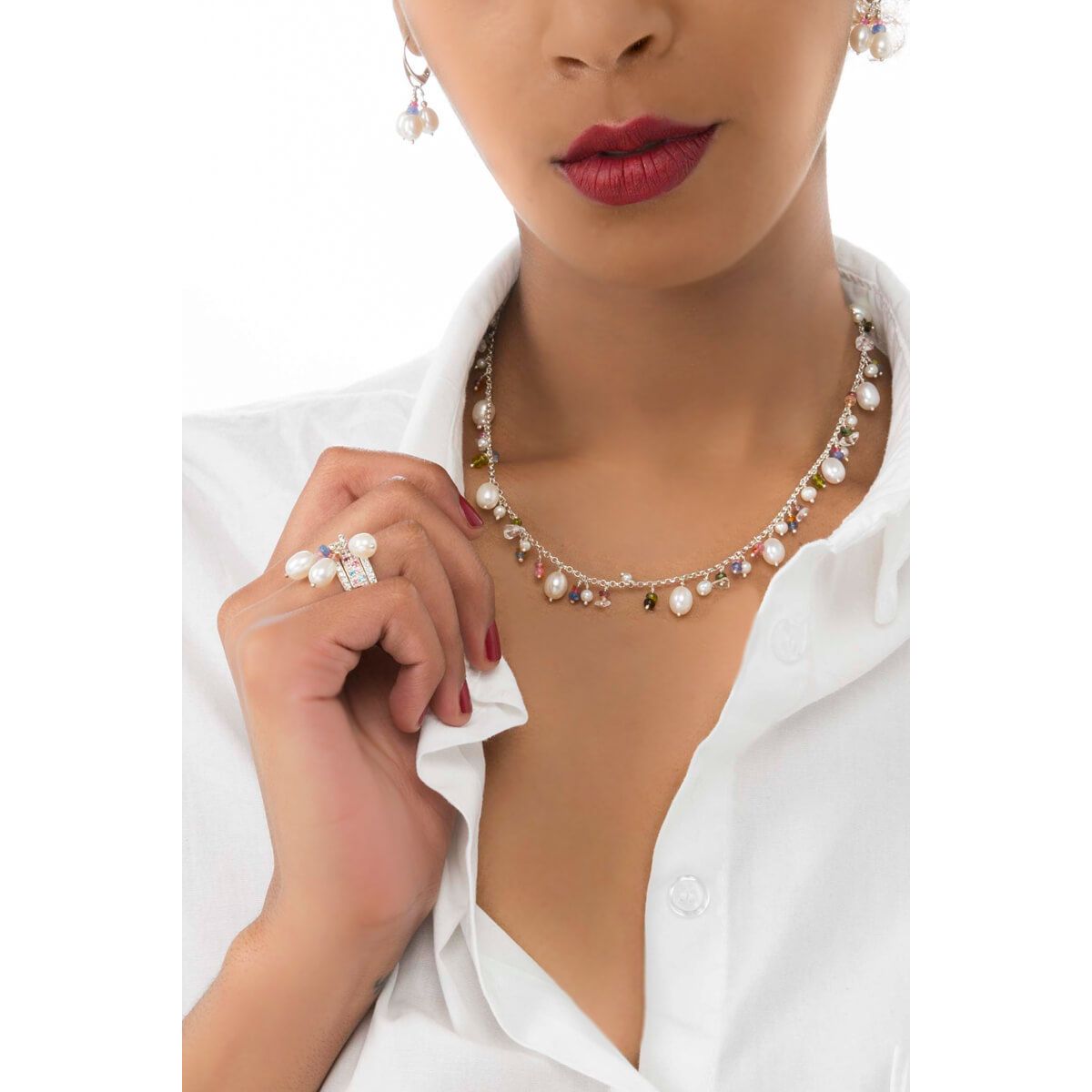 Anello con perle di fiume, rodoliti, topazi azzurri e tormaline